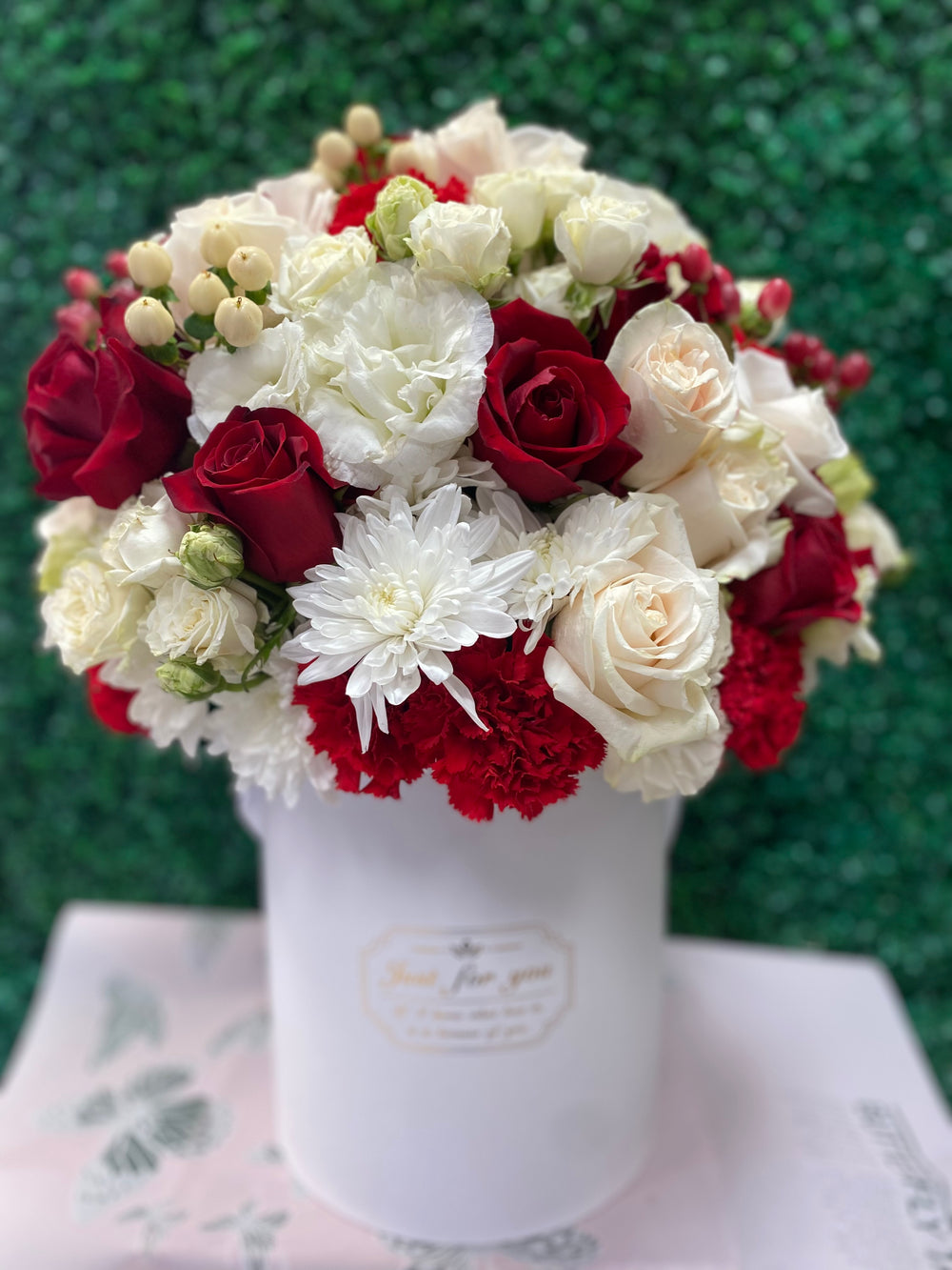 Embrace the essence of love and sophistication with our "Just For You Rose Box." This enchanting arrangement combines the passionate allure of a dozen rich red roses with the purity of a dozen pristine white roses, creating a stunning visual representation of unity and romance. Nestled alongside are delicate white spider mums and graceful lisianthus, enhancing the bouquet's elegance.